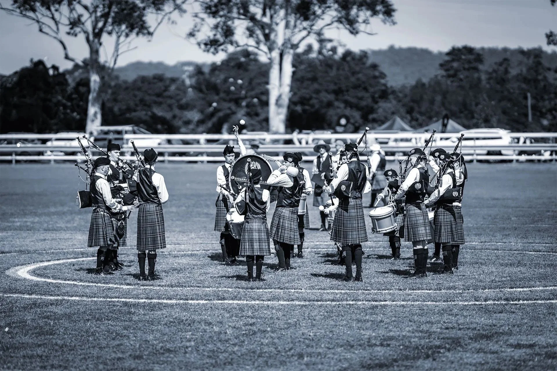 A pipe band begins to form. The sound builds, low and full, settling into the space around you. Conversations soften. People turn. For a few minutes, everyone is held in the same moment.